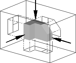 Image of object in box, with views of object projected in the direction of sight onto walls using first-angle projection. |