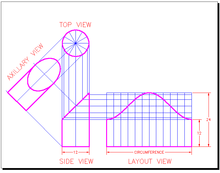 The part is drawn in Magenta, and the projection lines are in Blue. What I needed to do was use the DIVIDE command to divide both the circle and the line that represents the circumference. Then it was a matter of projecting down and to the right from the circle, and up from the circumference line. This gave me a grid to use for the SPLINE to create the curve. The Auxiliary view was drawn with a few projection lines and an ELLIPSE.